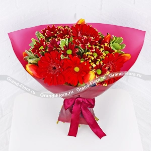 Свидание в Рио + шоколад - букет из хризантем,гербер и роз с шоколадом