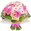 Уменьшенный: роза розовая - 3 шт, роза кустовая розовая - 2 шт, хризантема кустовая светло-фиолетовая - 3 шт, лист аспидистры загнутый - 3 шт, упаковка натуральная.