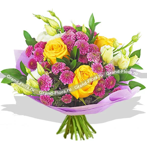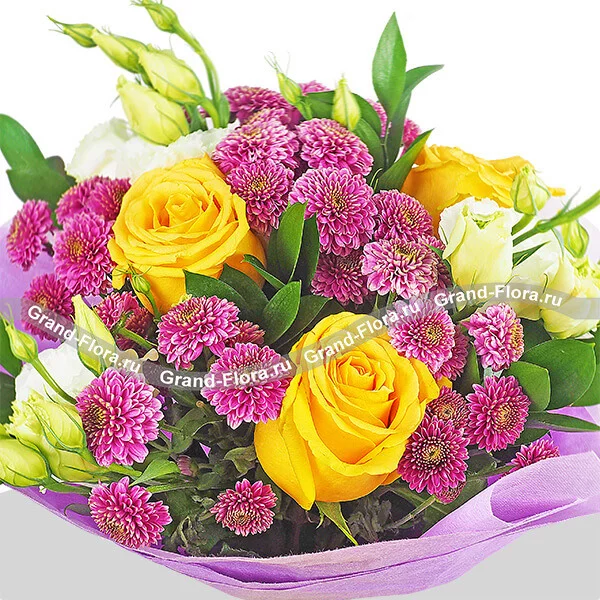 Букет выполнен из ярких желтых роз, с яркими акцентами фиолетовой кустовой хризантемы сантини и кульминацией в виде эустомы, свободно расположенной по периметру букета. Завершает композицию фиолетовый фетр. Диаметр букета от 25 см до 45 см,в зависимости от выбранного Вами варианта букета. Высота букета от 40 см. Обращаем Ваше внимание, что состав и оформление букета могут отличаться.