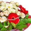 Уменьшенный: Гербера красная/розовая/малиновая - 3 шт., хризантема белая кустовая - 1 шт., роза кустовая кремовая - 1 шт., салал - 2 шт., фетр красный.